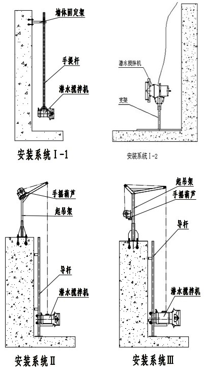 客戶訂貨時,請?zhí)峁┏厣?span>H及池形圖,以便廠房加工時確定導桿或?qū)蜾摻z的尺寸。安裝系統(tǒng)的材質(zhì)采用不銹鋼(或碳鋼)制造。安裝系統(tǒng)中除導桿或?qū)蜾撈鸬醯鬃猓嗯_攪拌機可公用一套起吊裝置。